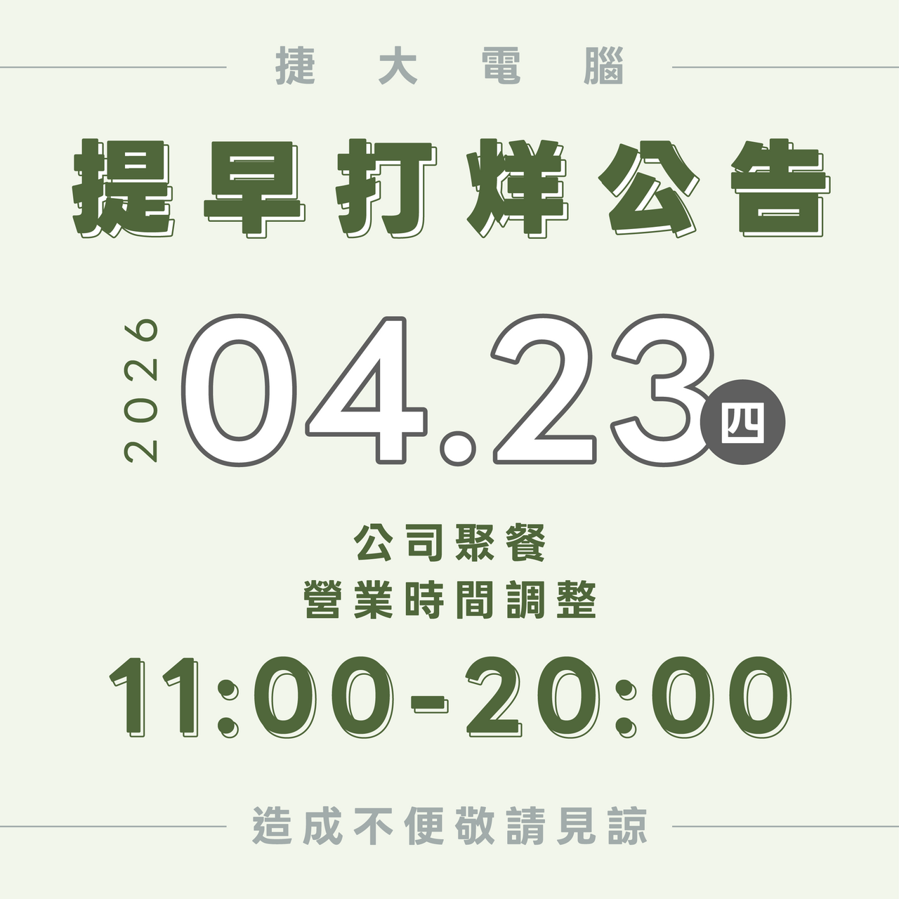 公告|四月營業時間調整