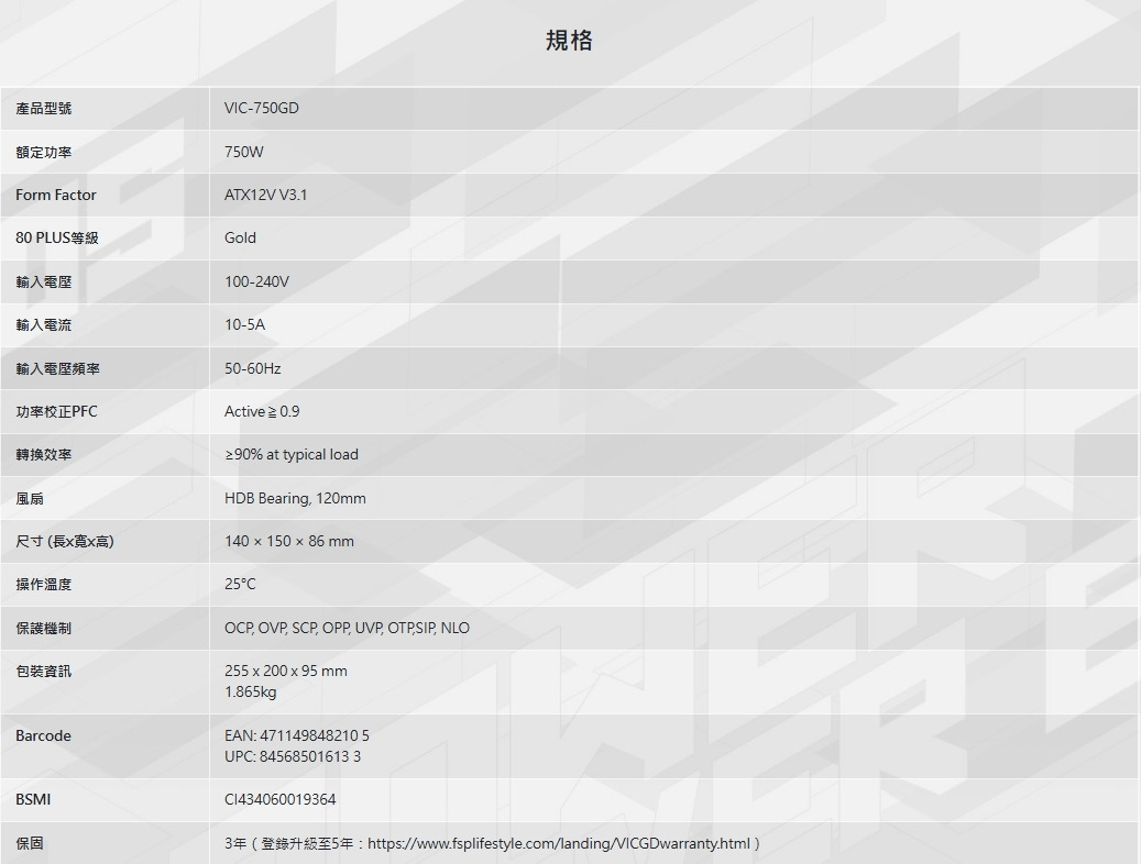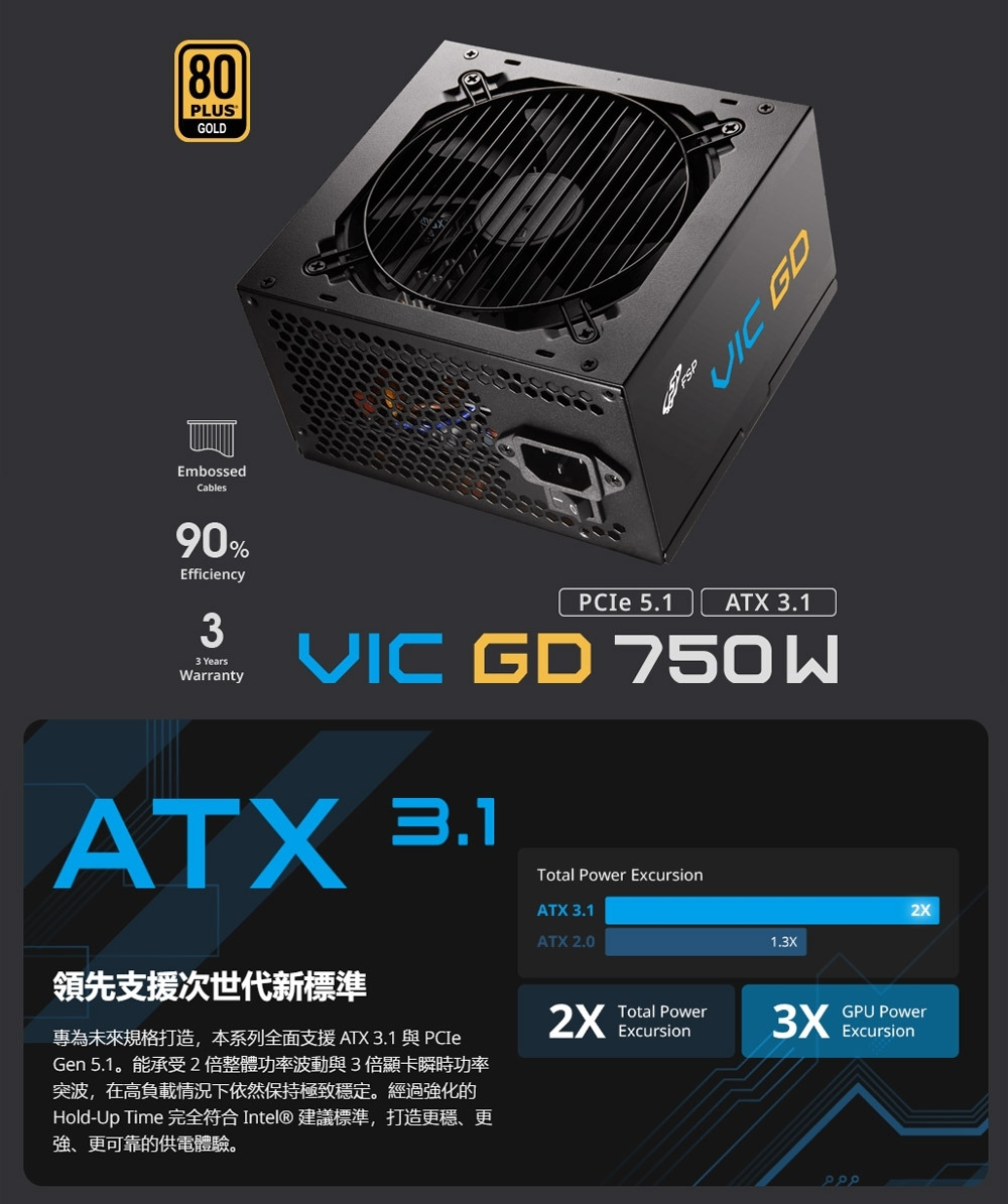 全漢 VIC GD 750W 金牌(ATX3.1/PCIE5.1/3+2年保)