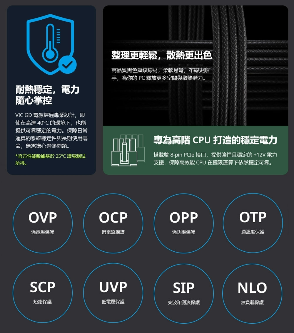 ‧全面性防護機制:OCP、OVP、SCP、OPP、UVP、OTP、SIP、NLO