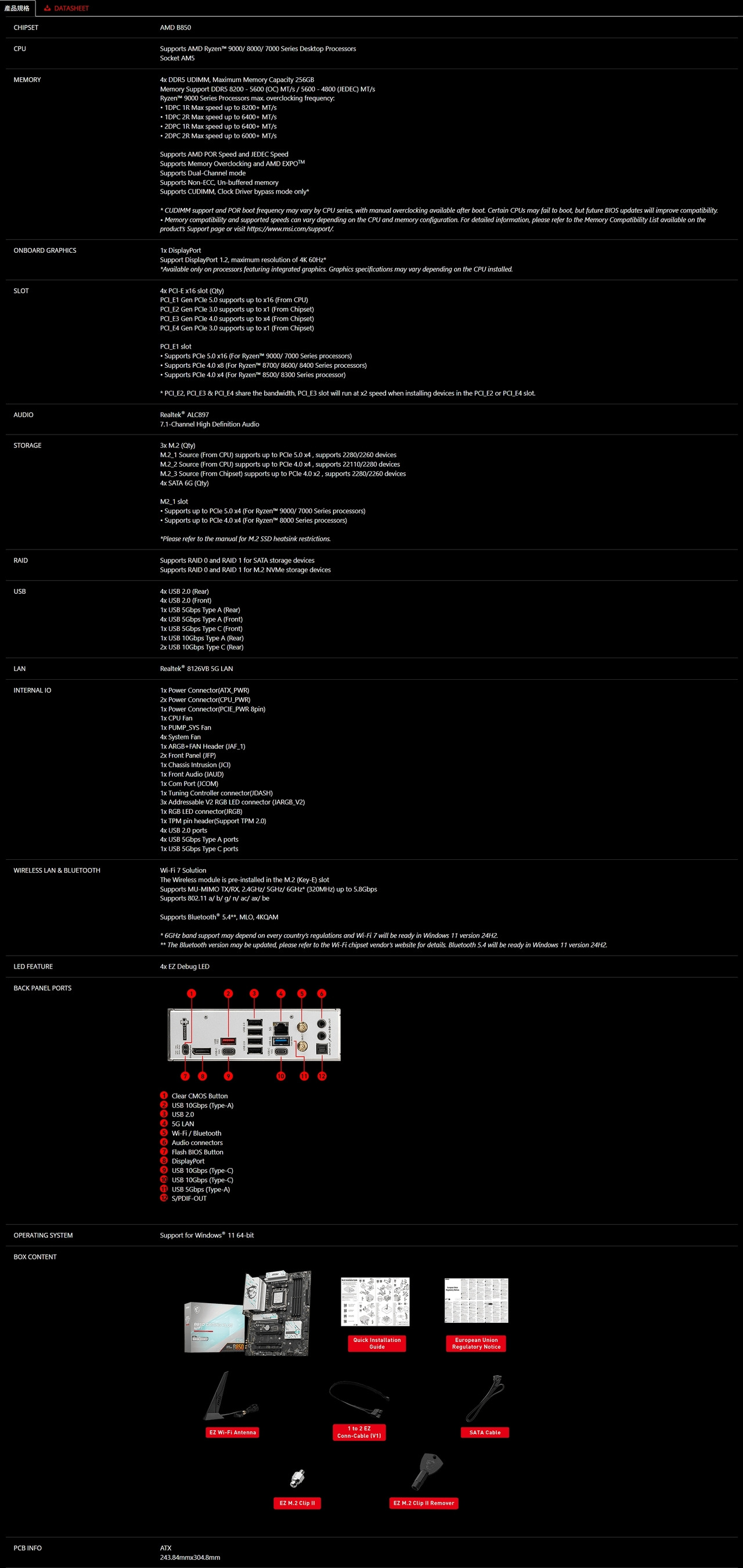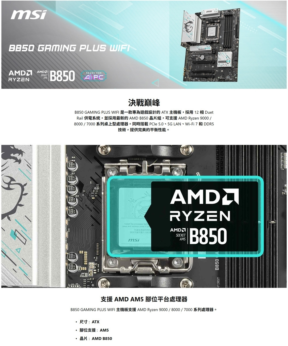 微星 B850 GAMING PLUS WIFI(ATX/3+2年保)