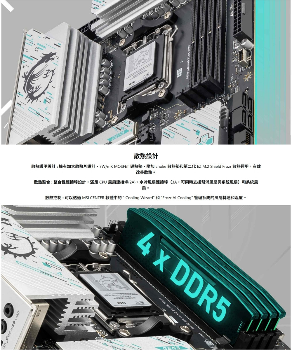 ‧散熱護甲 :延伸加大散熱片、附加 7W/mK 的 MOSFET 散熱墊、附加choke電感散熱墊熱墊以及 M.2 Shield Frozr II,專為高效能系統和持久的使用體驗而設計。