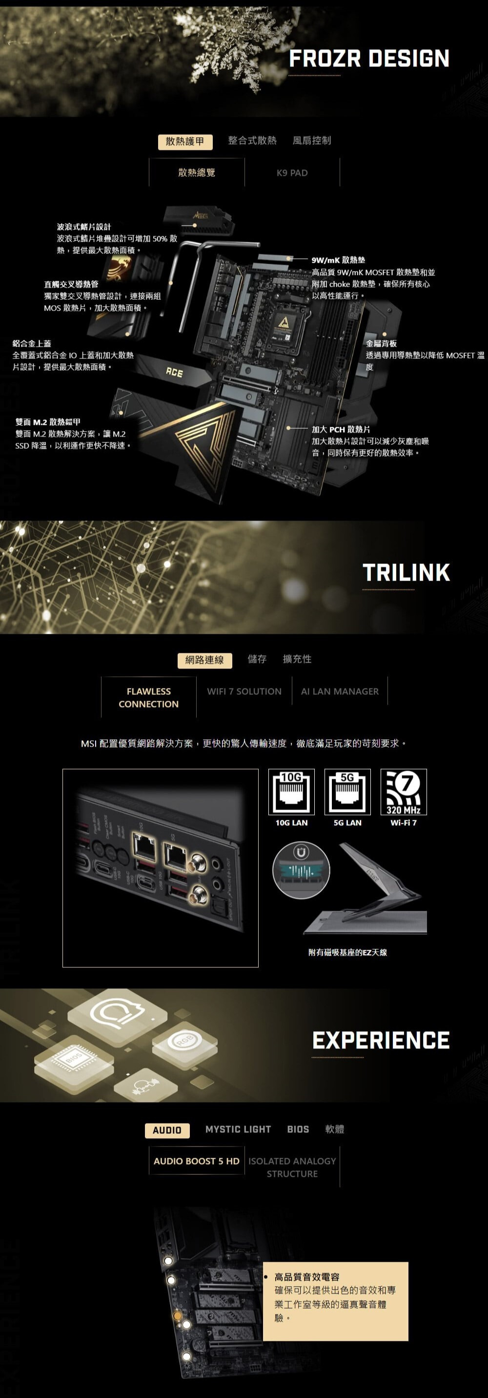 ‧散熱護甲設計 : 波浪式鰭片設計、直觸交叉導熱管、MOSFET 底板, 9W/mK MOSFET 散熱墊片、雙面 M.2 Shield Frozr 散熱鎧甲和AI 軟體,提供出色的散熱效果。