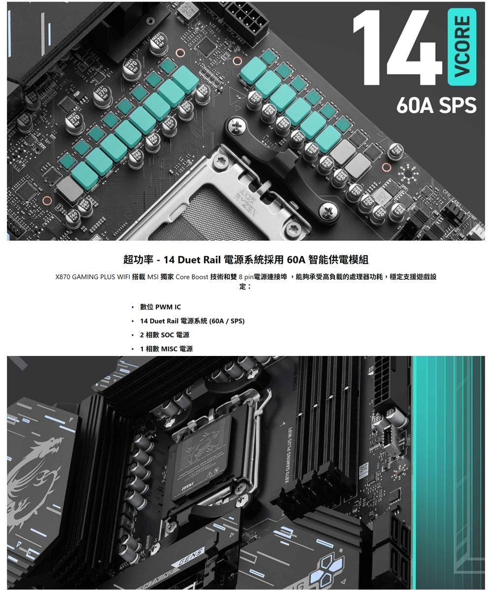 ‧超性能 : 14+2+1 Duet Rail 電源系統並採用雙 8-pin CPU 電源連接埠、Core Boost、Memory Boost、採用 2oz 厚度銅的6層伺服器等級PCB。