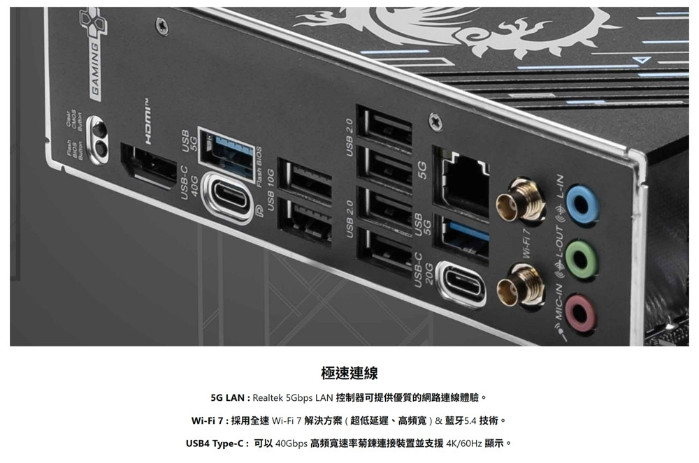 ‧Ultra Connect:USB4 和 5G LAN 與 Wi-Fi 7 解決方案 - 專業和多媒體用途的最新解決方案,提供安全、穩定、高速的網路和資料傳輸