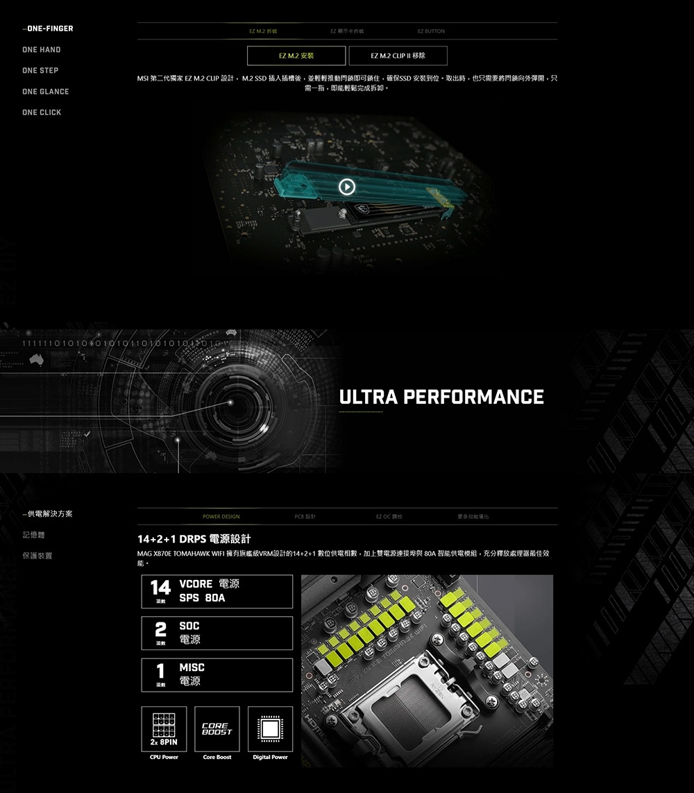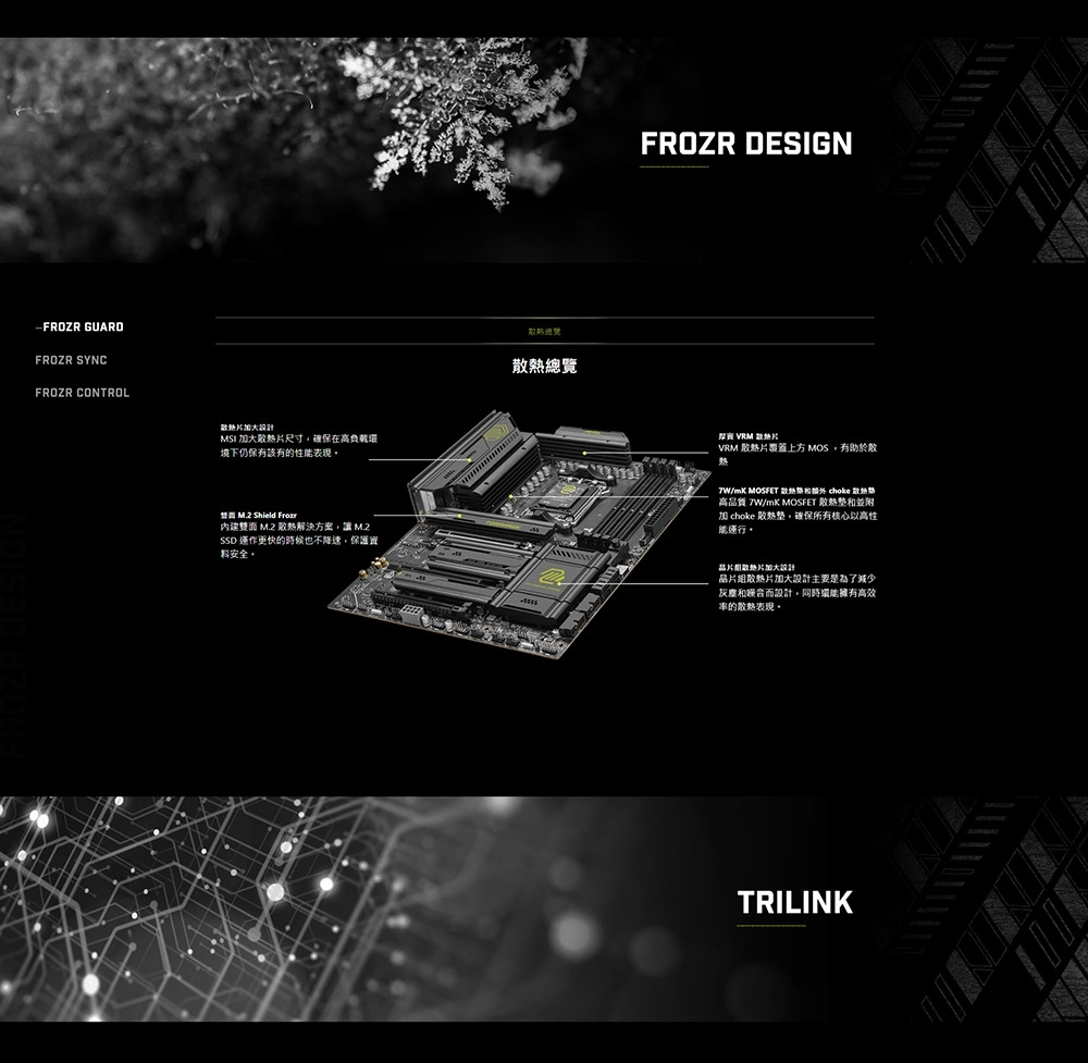 ‧散熱護甲 :延伸加大散熱片、附加 7W/mK 的 MOSFET 散熱墊、附加choke電感散熱墊熱墊以及 EZ M.2 Shield Frozr II,專為高效能系統和持久的使用體驗而設計。