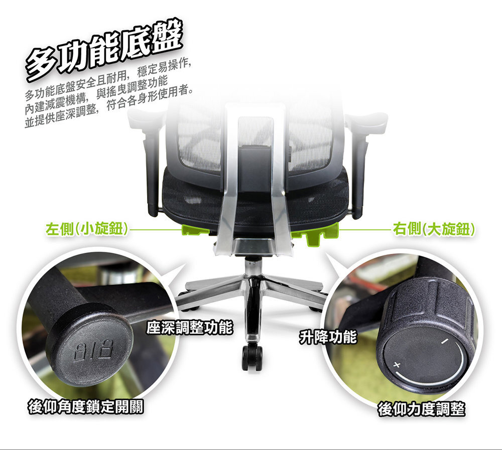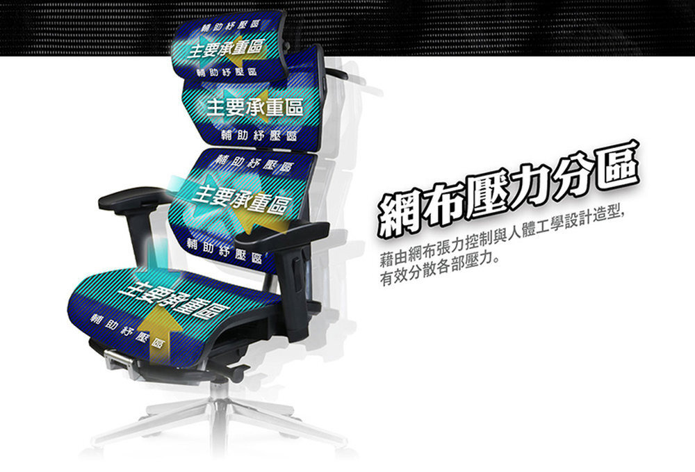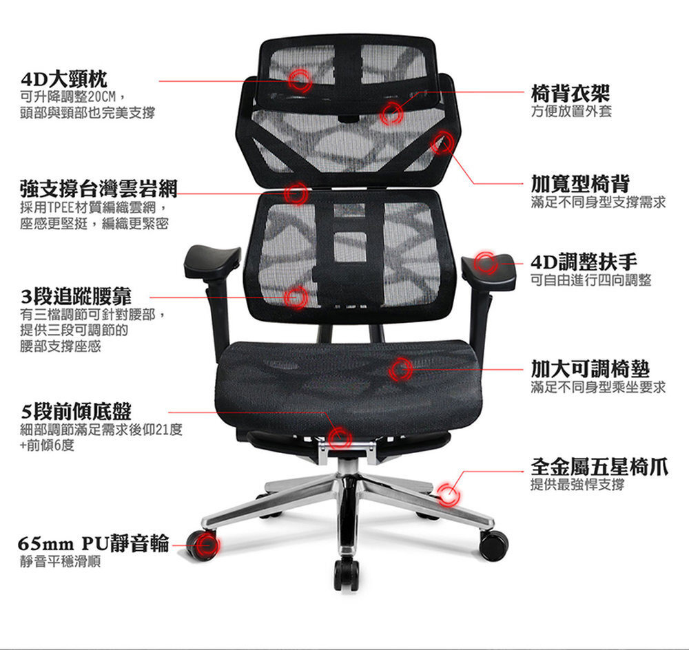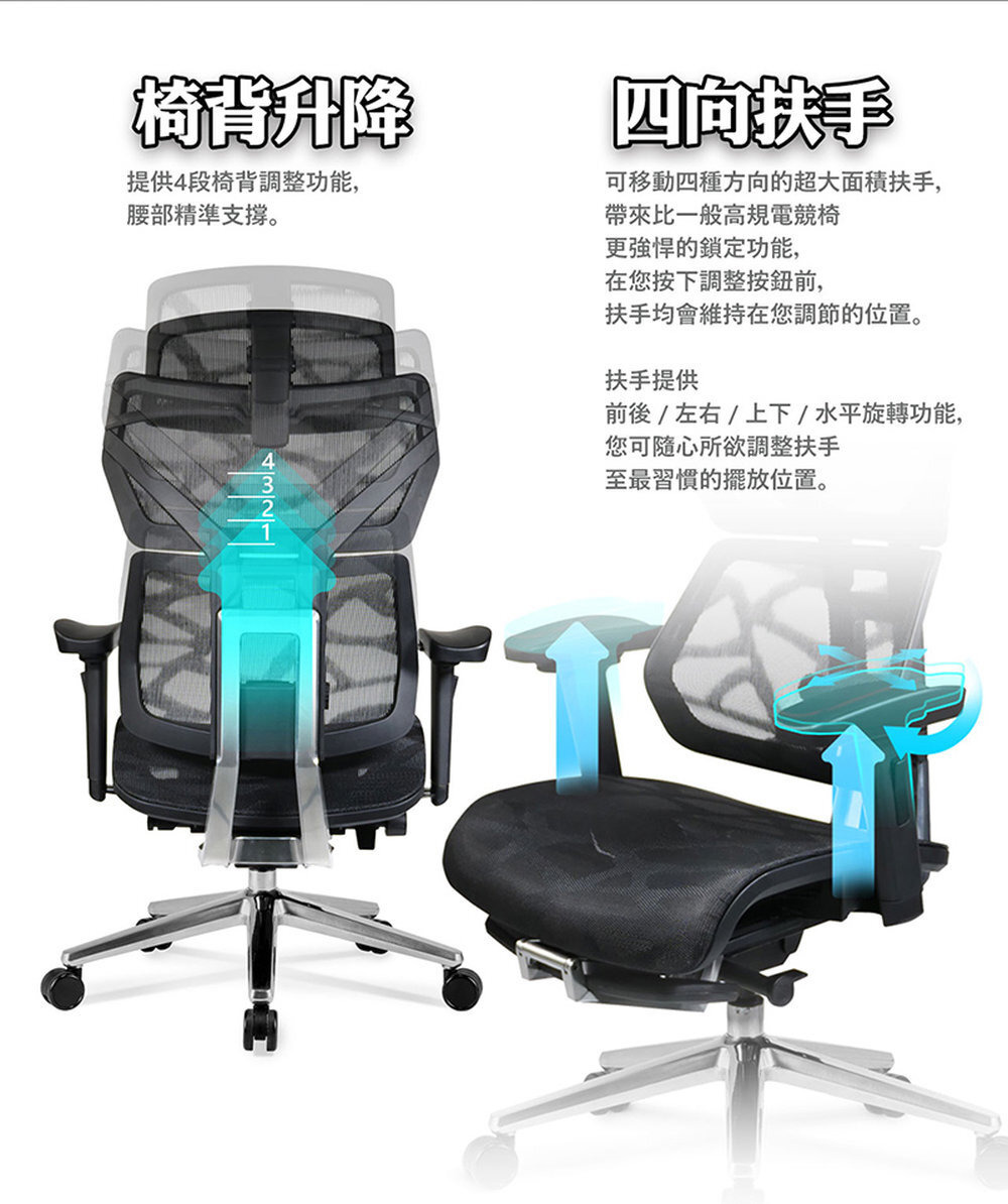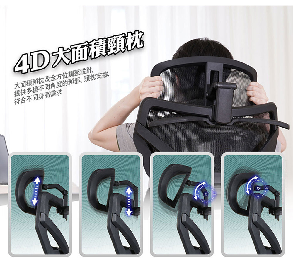 椅背型式 : 舒適全網布四段升降椅背(含衣架功能)