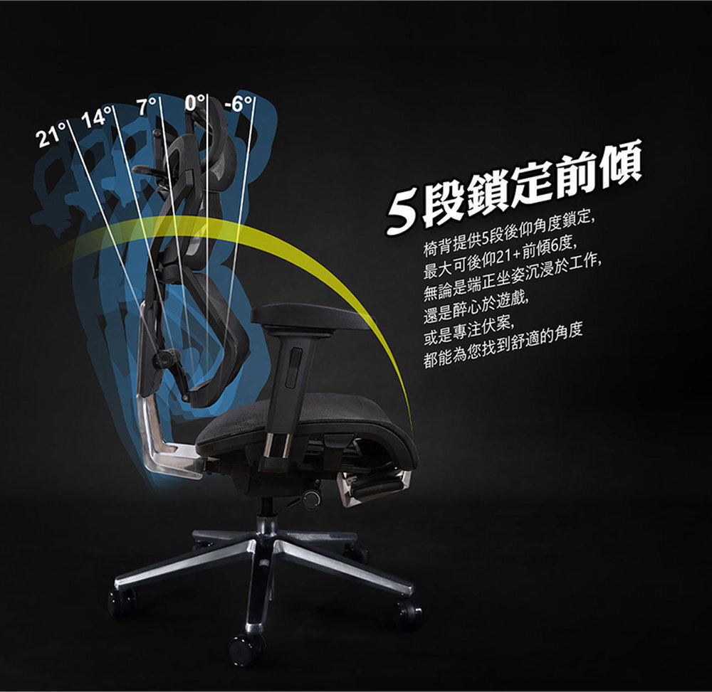 椅背傾仰角度 : 21+6° (前傾6°,後仰21°)