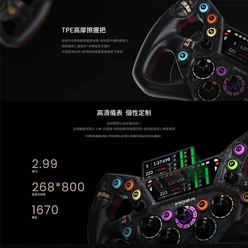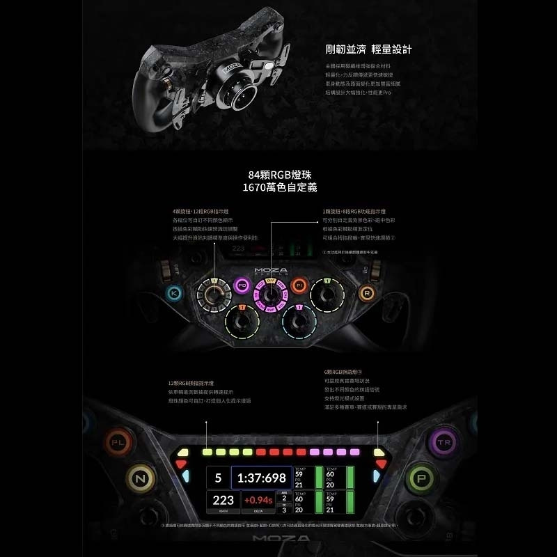 • 支援 MOZA Pit House 智能遙測與燈光設定