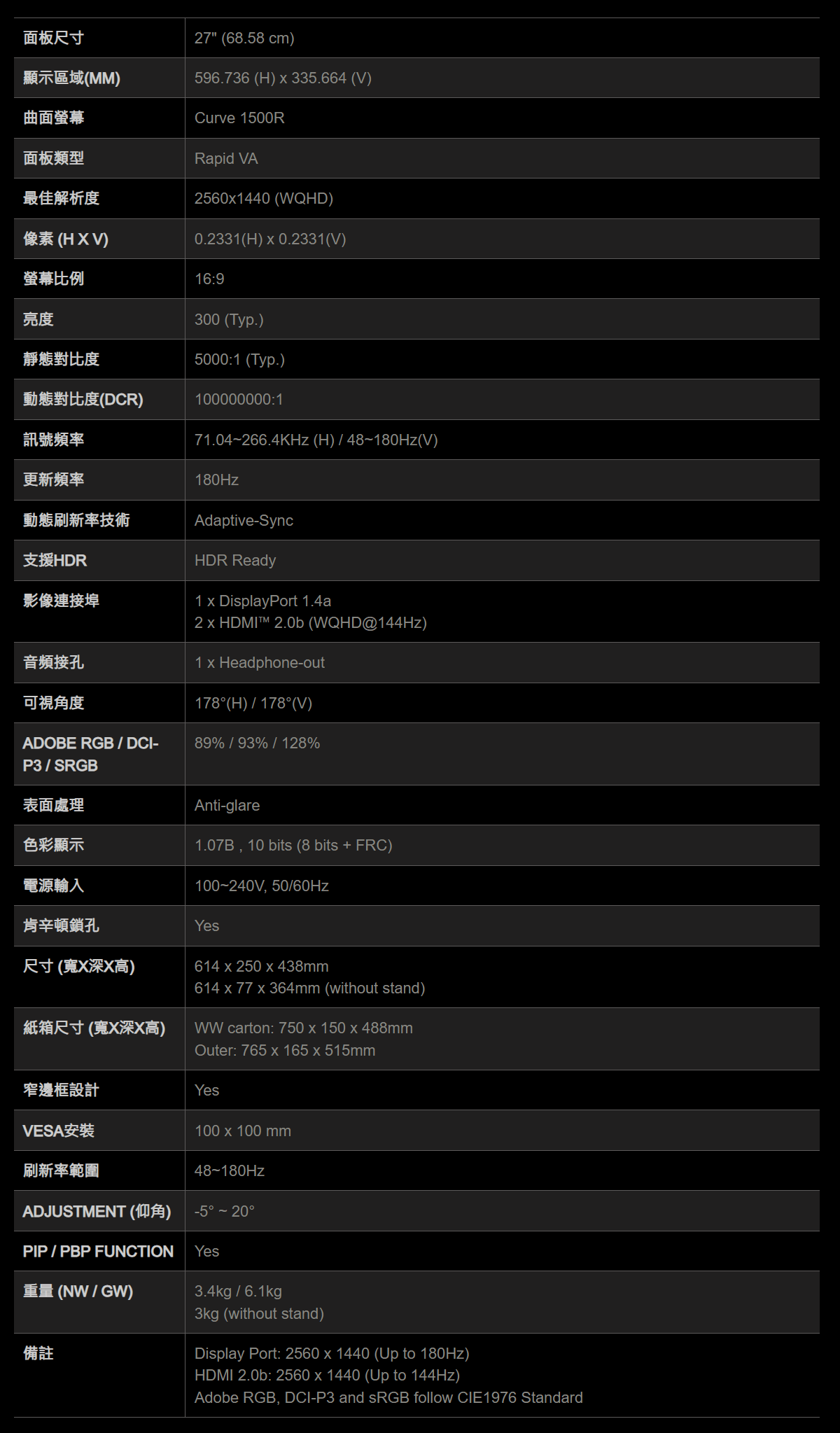 • 1500R 曲面設計,視線更集中,看久也比較不累