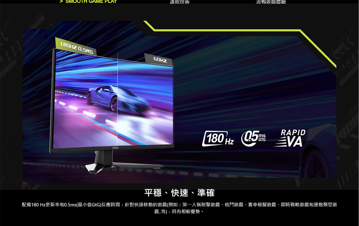 • 180Hz 更新率搭配 0.5ms 反應時間,畫面順、操作更跟手