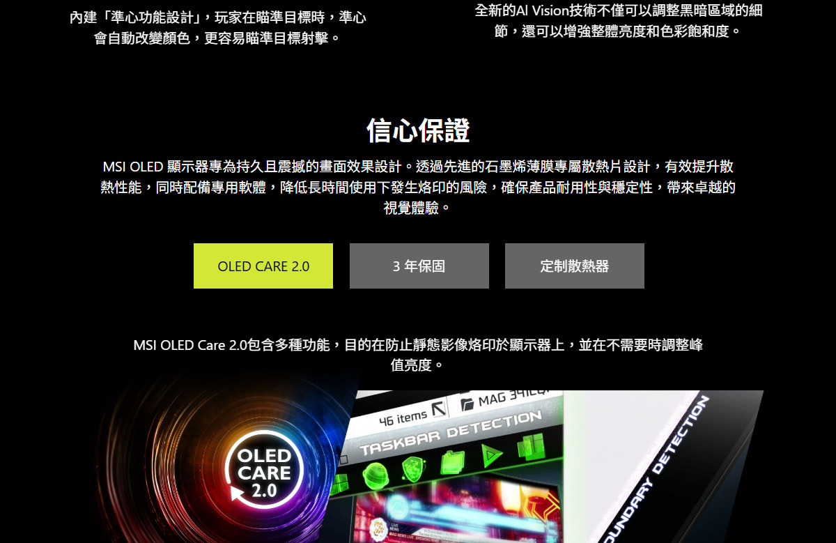 • MSI OLED Care 2.0 + 三年防烙印保固,長時間使用更安心
