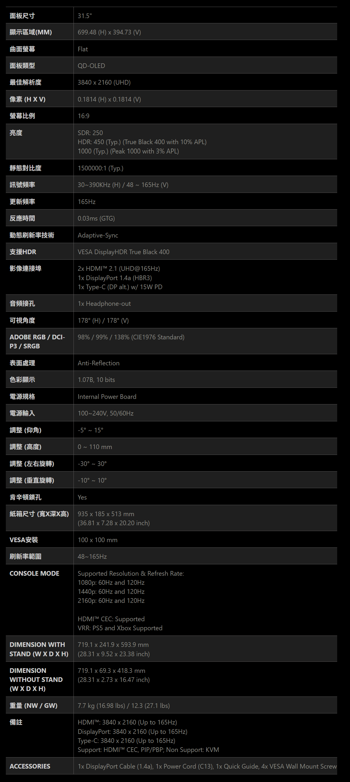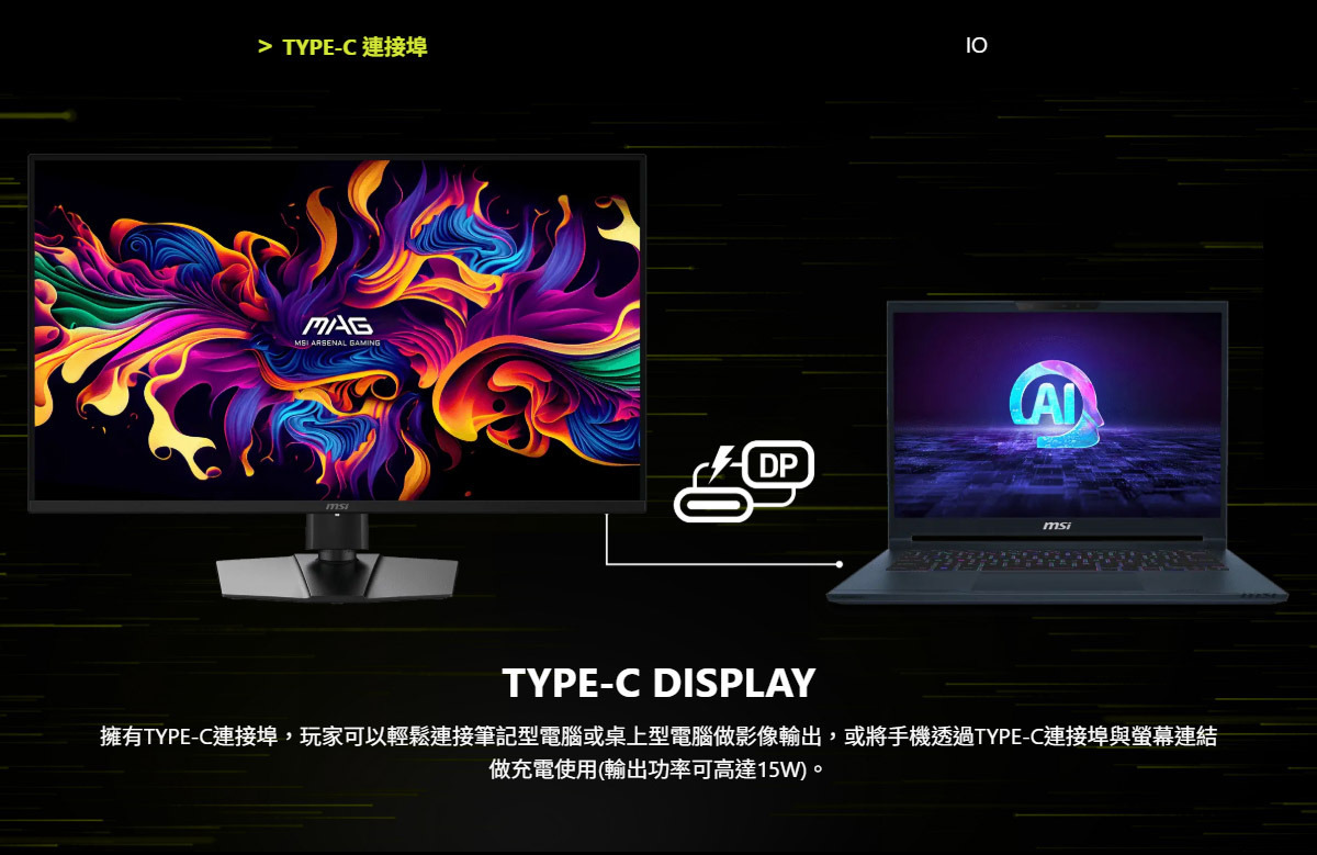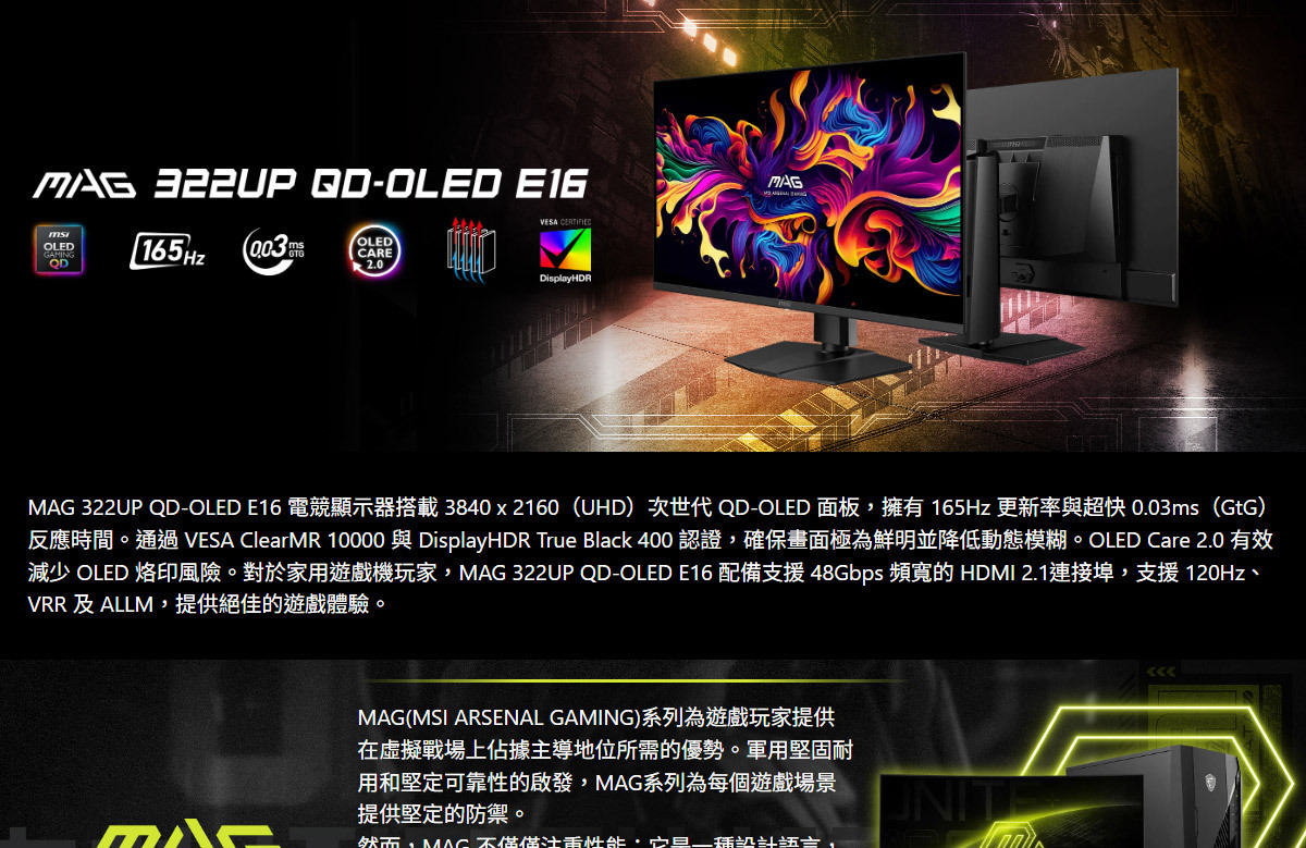 MSI MAG 322UP QD-OLED E16 平面電競螢幕 (32型/4K/165Hz/0.03ms/QD-OLED/Type-C)