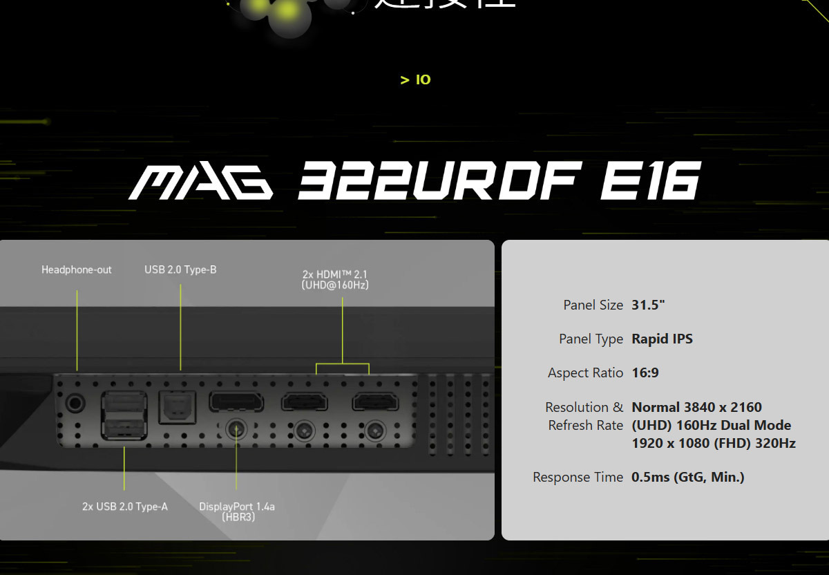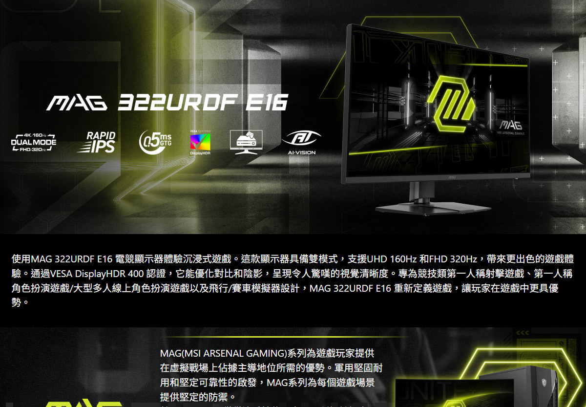 MSI MAG 322URDF E16 平面電競螢幕 (32型/4K/160Hz/0.5ms/IPS)