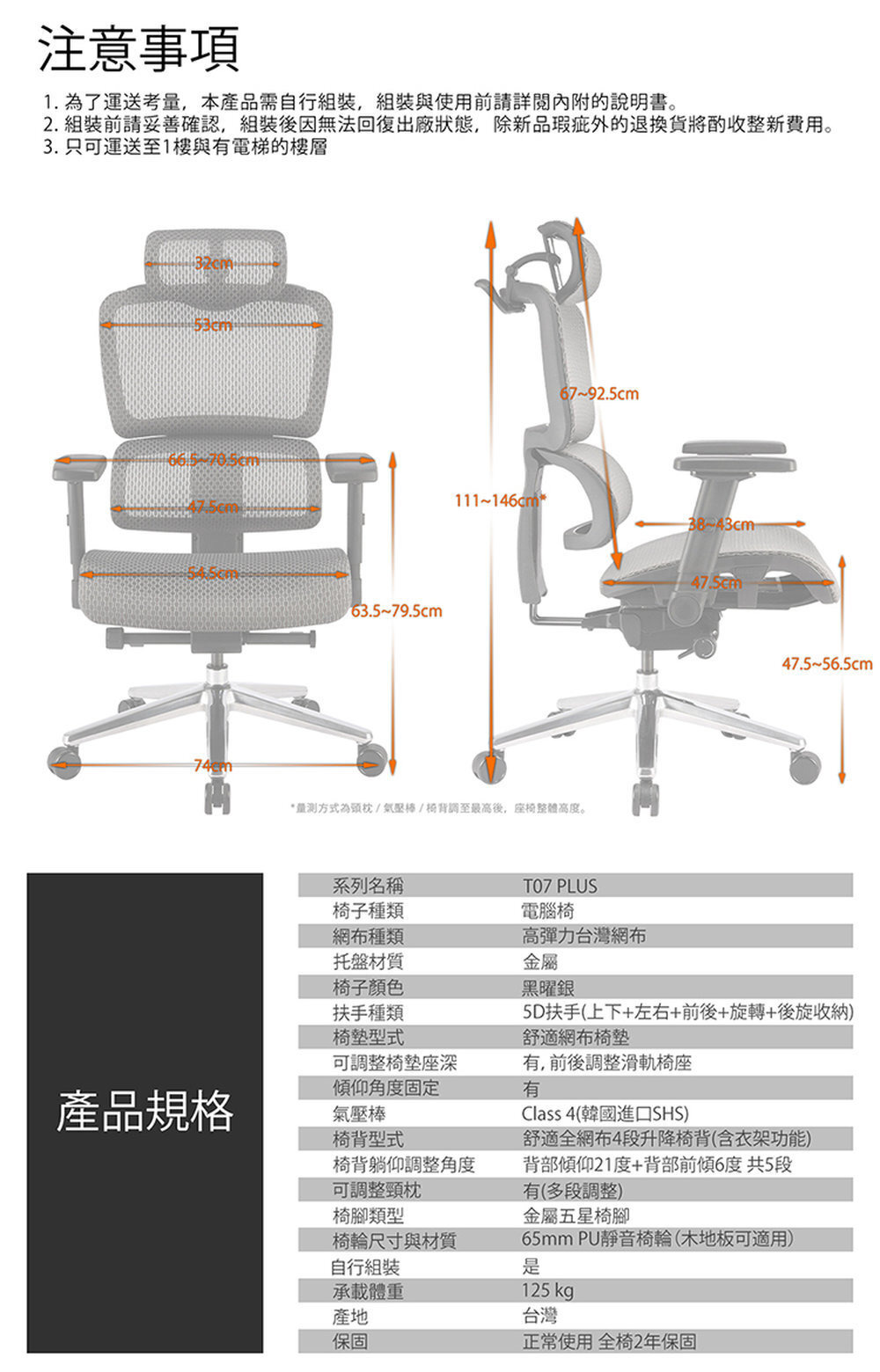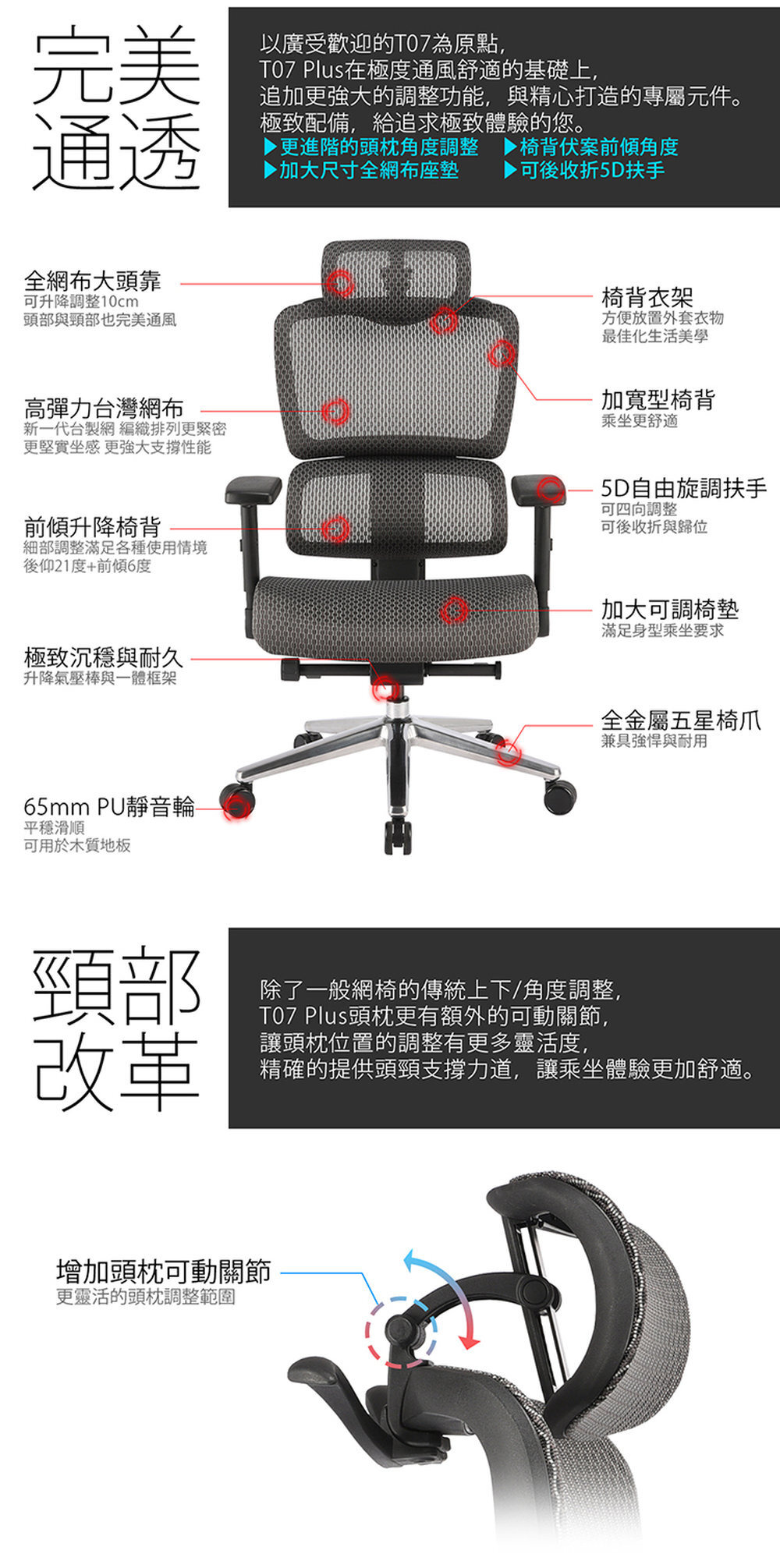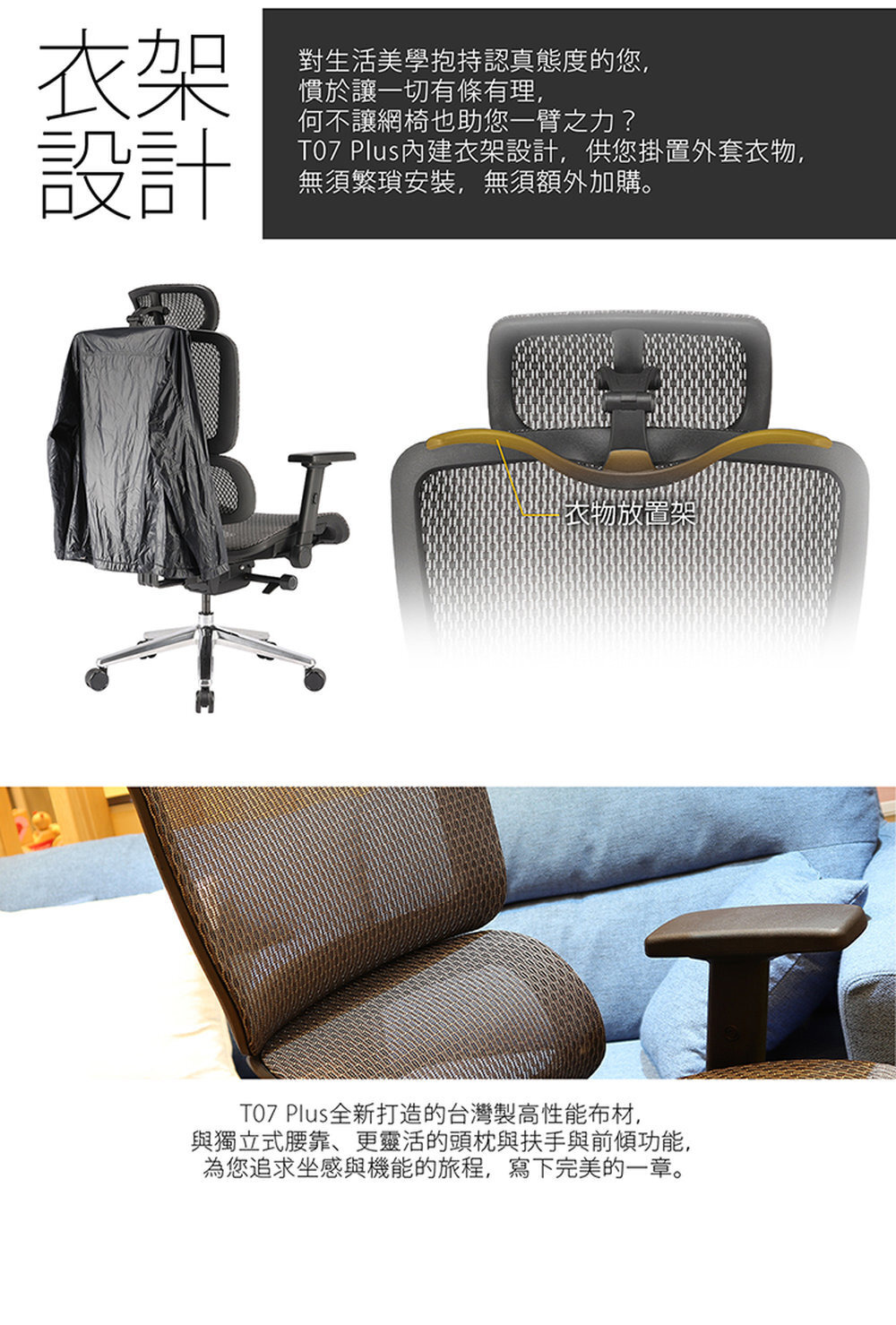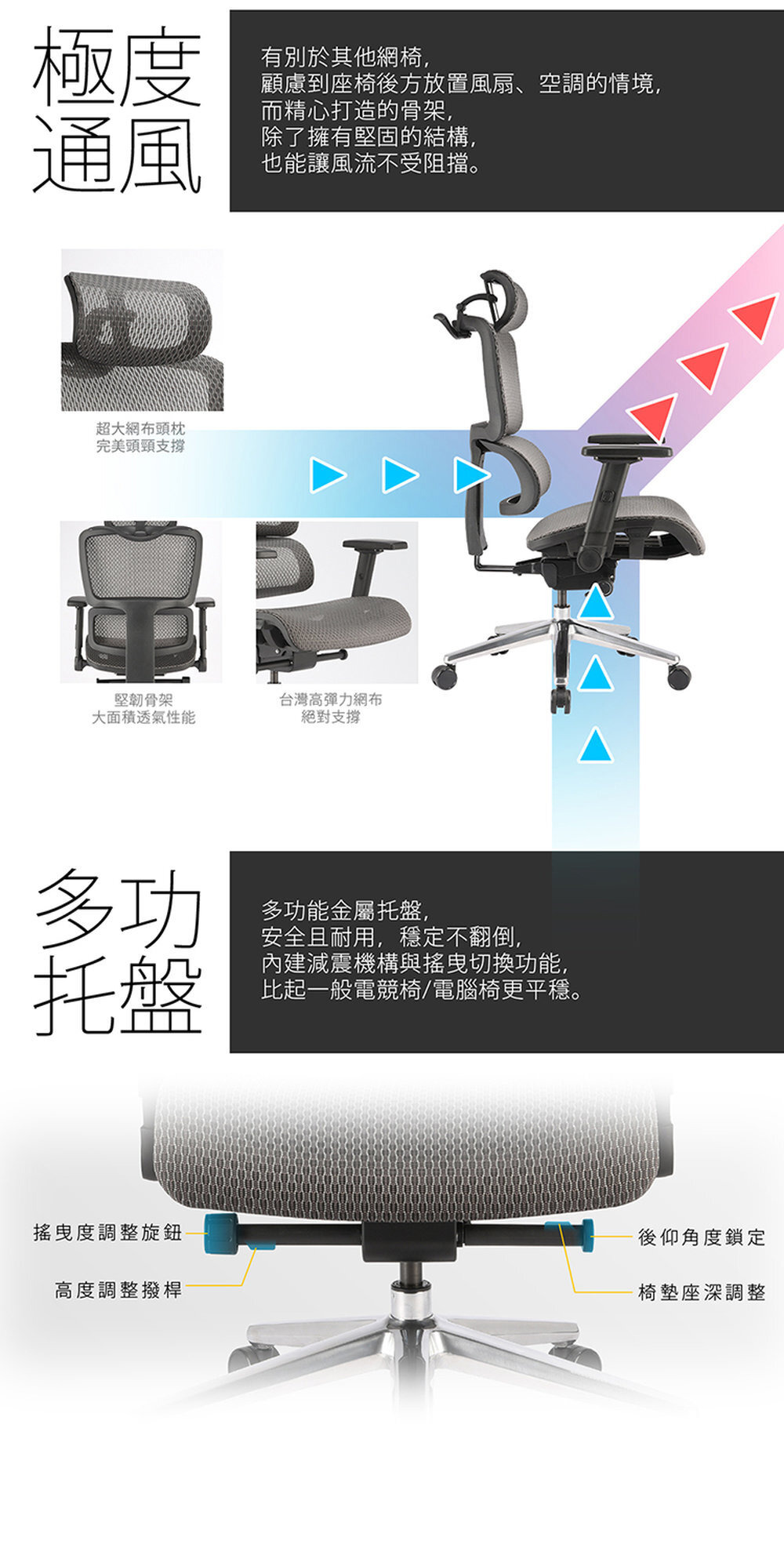 椅背型式:舒適全網布四段升降椅背(含衣架功能)