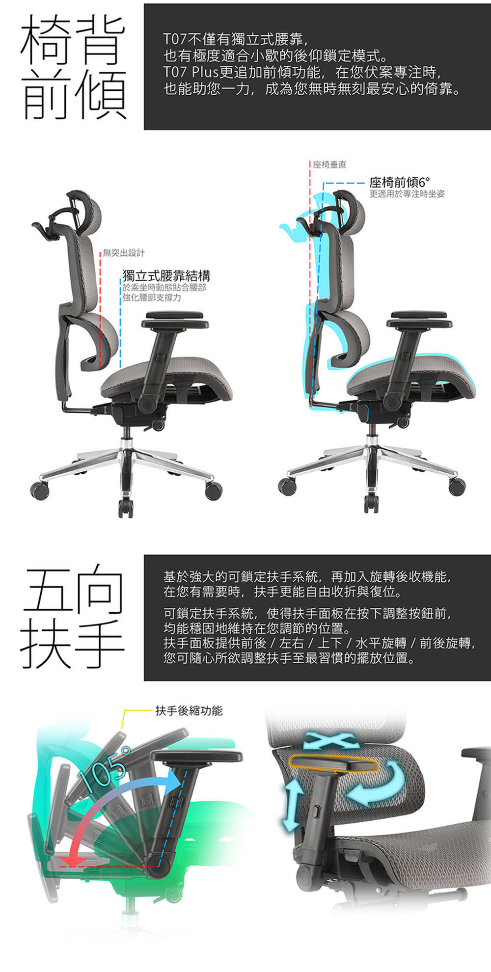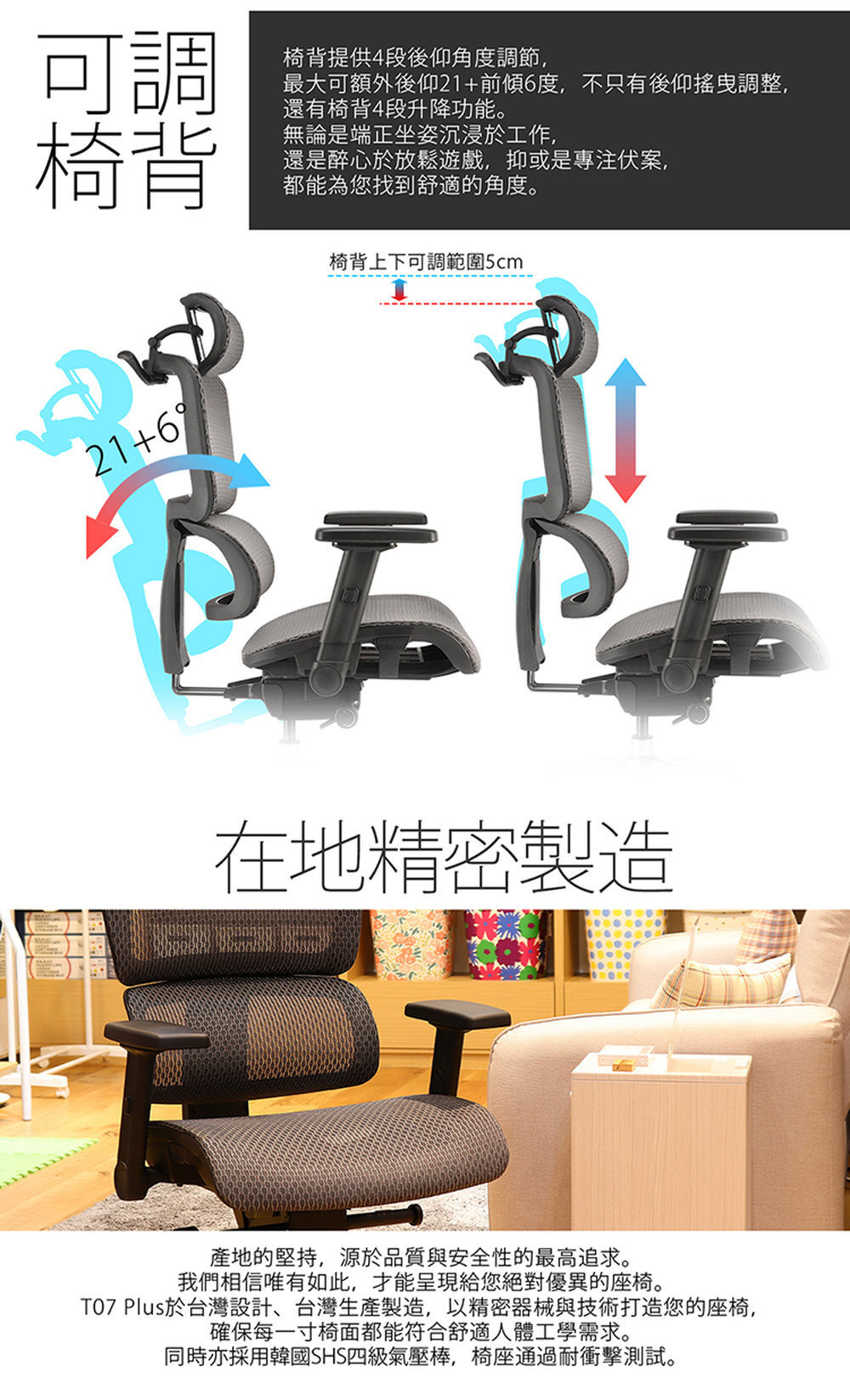 椅背傾仰角度:21° + 6°(前傾 6°,後仰 21° / 5 段)