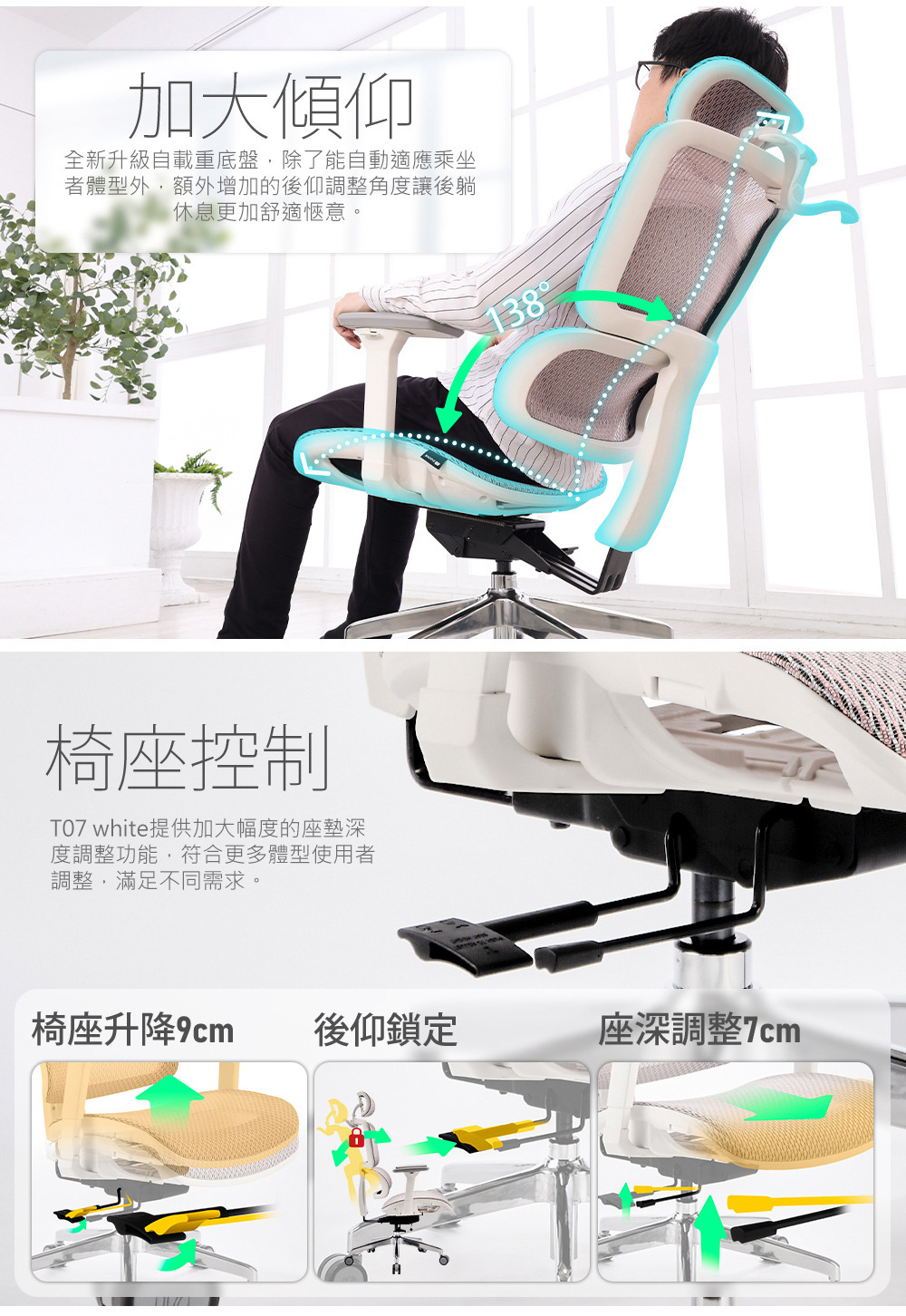 可調整椅墊座深:有,前後調整滑軌椅座