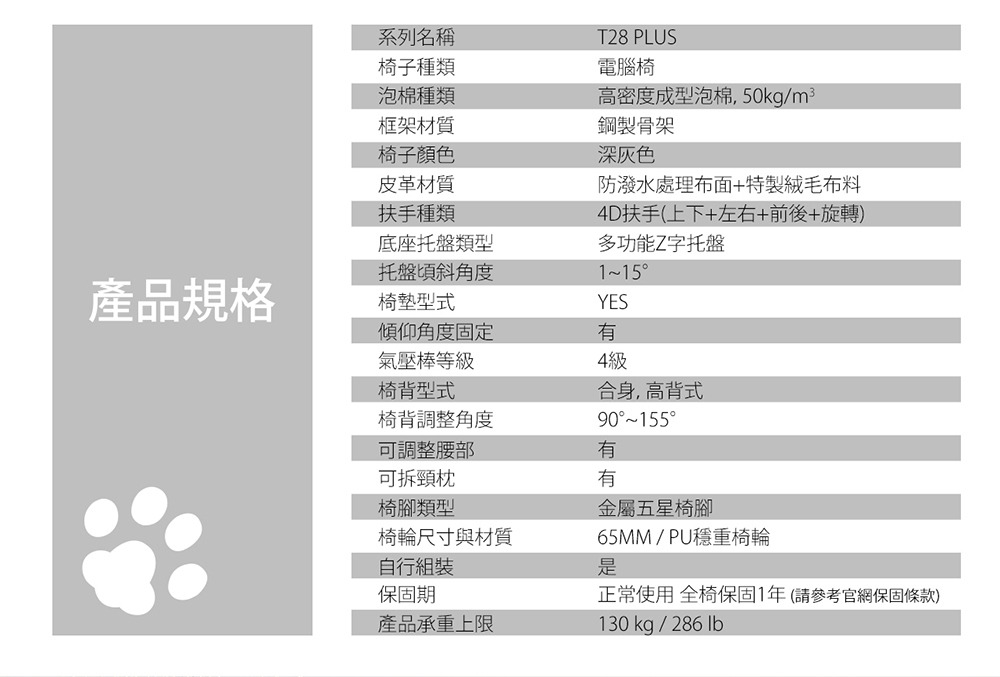 產品承重上限:130Kg / 286 lb