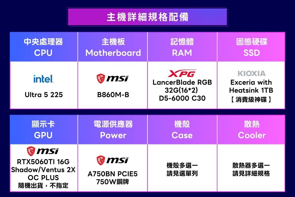 U5十核+RTX5060TI 16G WIN11電競電腦【玄霜劍訣】(225/B860/32G/1T/任選散熱)