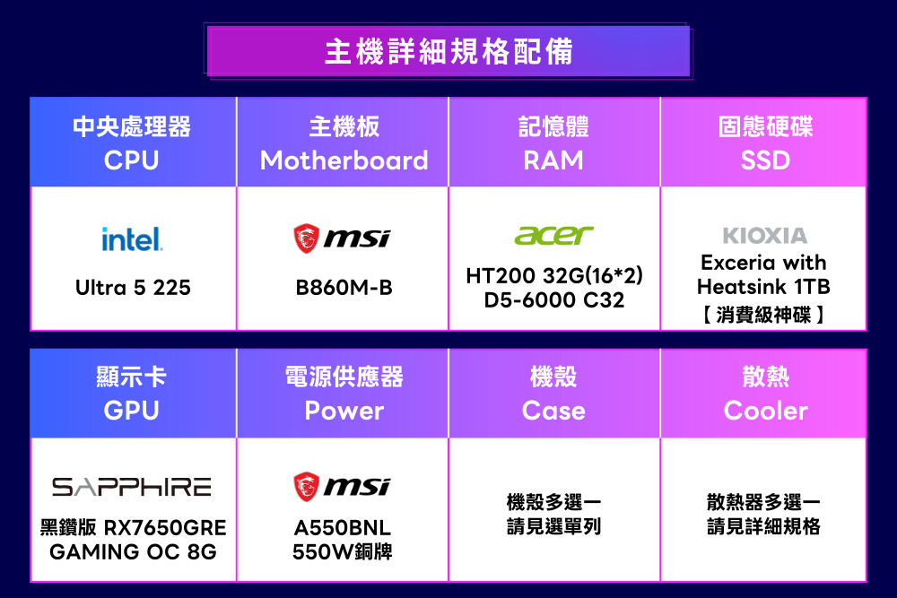 U5十核+RX7650GRE WIN11電競電腦【劍膽琴心】(225/B860/32G/1T/任選散熱)