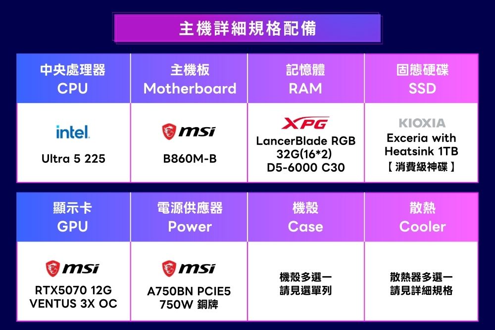 U5十核+RTX5070 WIN11電競電腦【荒城夜營】(225/B860/32G/1T/任選散熱)