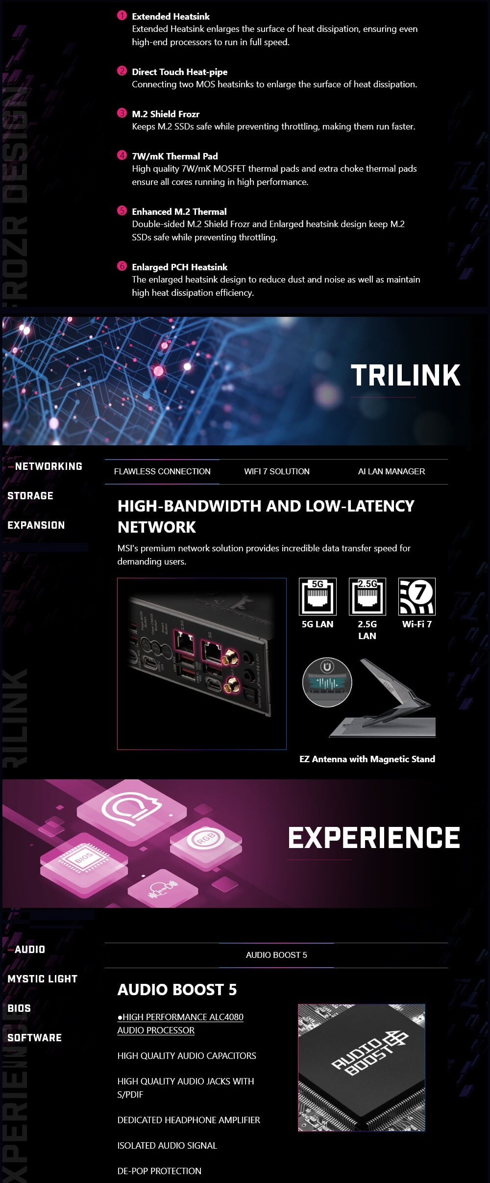 ‧散熱護甲 :延伸加大散熱片、附加 7W/mK 的 MOSFET 散熱墊、附加choke電感散熱墊熱墊以及 M.2 Shield Frozr ,專為高效能系統和持久的使用體驗而設計。